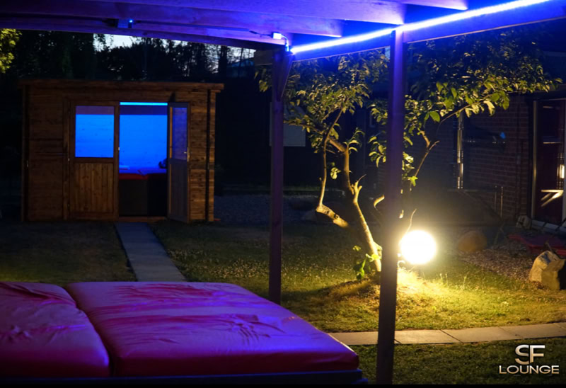 Wenn das Wetter mitspielt ist natürlich auch unser ca. 1.000 qm großer, nicht einsehbarer Aussenbereich mit Outdoor-Spielwiese, Love-Haus, Strandkorb, Liegen und diversen Sitzgelegenheiten sowie Aussenduschen geöffnet. Besonders am Abend bietet der Aussenbereich mit indirekter Beleuchtung ein ganz besonderes Swinger Erlebnis.